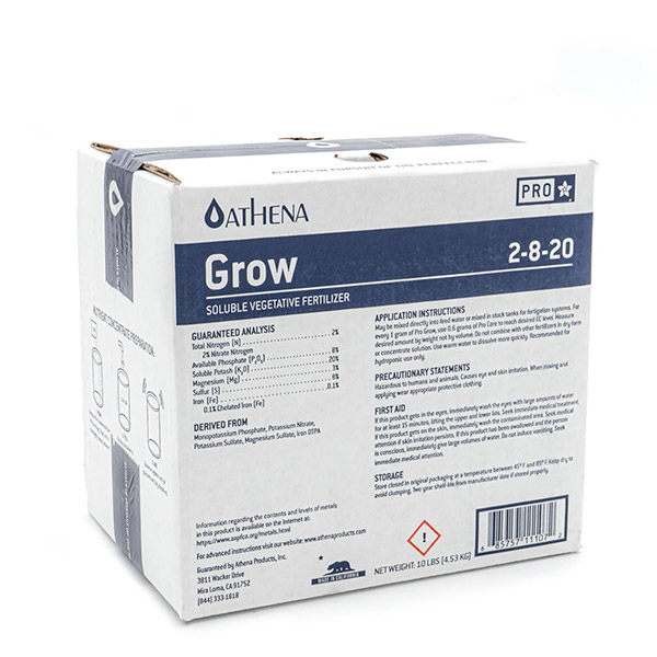 O estágio de crescimento vegetativo exige nutrição completa para estabelecer raízes fortes e folhagem exuberante. Athena Pro Grow é uma mistura balanceada de fertilizantes solúveis formulados para produtores comerciais para agilizar a irrigação. Use com Athena Pro Core para uma receita completa e balanceada.
