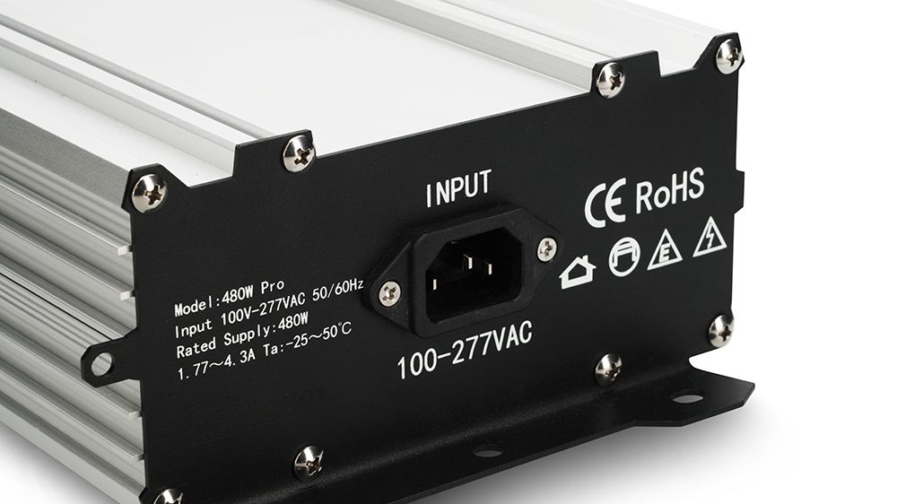 Inclui um balastro eletrónico regulável em 5 etapas. Recomenda-se uma intensidade entre 50 e 60% para estacas e plantas jovens ou em fase de crescimento, e entre 80 e 100% para plantas maduras ou em fase de floração.