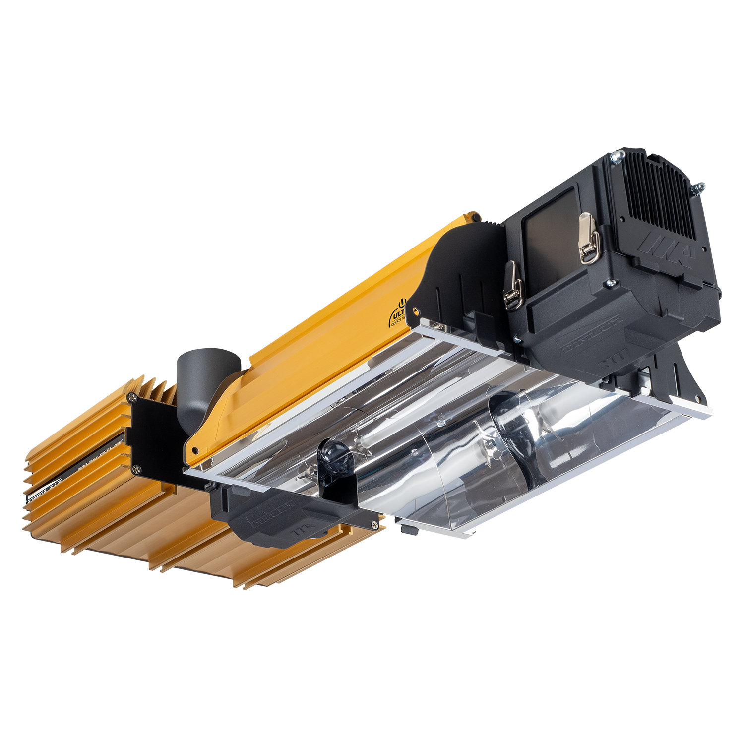 O refletor Ultra Optics 98 foi projetado com base no princípio Single Bounce Clear Sight (SBCS). Isso significa que CADA fóton vai “saltar” apenas uma vez com o refletor antes de ir para o seu dossel. O proporciona maior vida útil da lâmpada e uma temperatura de operação mais fria. Um soquete de 50 mm na parte superior do capô permite que o ar suba passivamente acima do acessório que também pode ser extraído com um exaustor. Isto leva a MENOR CUSTOS DE REFRIGERAÇÃO.
