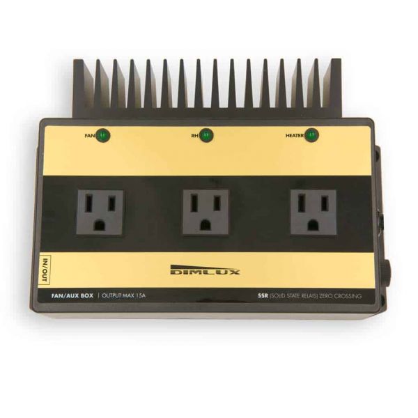 A caixa Fan/Aux possui 3 saídas para que um aquecedor, humidificador, desumidificador e ventilador possam ser conectados ao Dimlux Maxi Controller. Todas as saídas são 15A. O controle do ventilador é eletrônico e silencioso em uso (sem zumbido). O controlador do ventilador tem um controle de temperatura e um RH dia e noite para controlar que são ajustáveis ​​individualmente. O controlador de temperatura funciona por meio do SmartLogic, este é um algoritmo que garante que a temperatura atual seja realmente igual à temperatura definida.