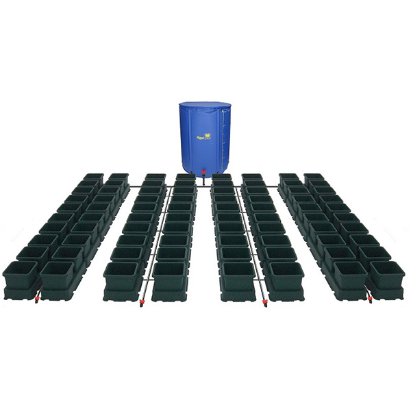Easy2grow da Autopot. É um sistema de 80 potes de 8,5 litros e 40 bandejas que possuem uma cavidade especial no centro delas onde está localizada a AquaValve.