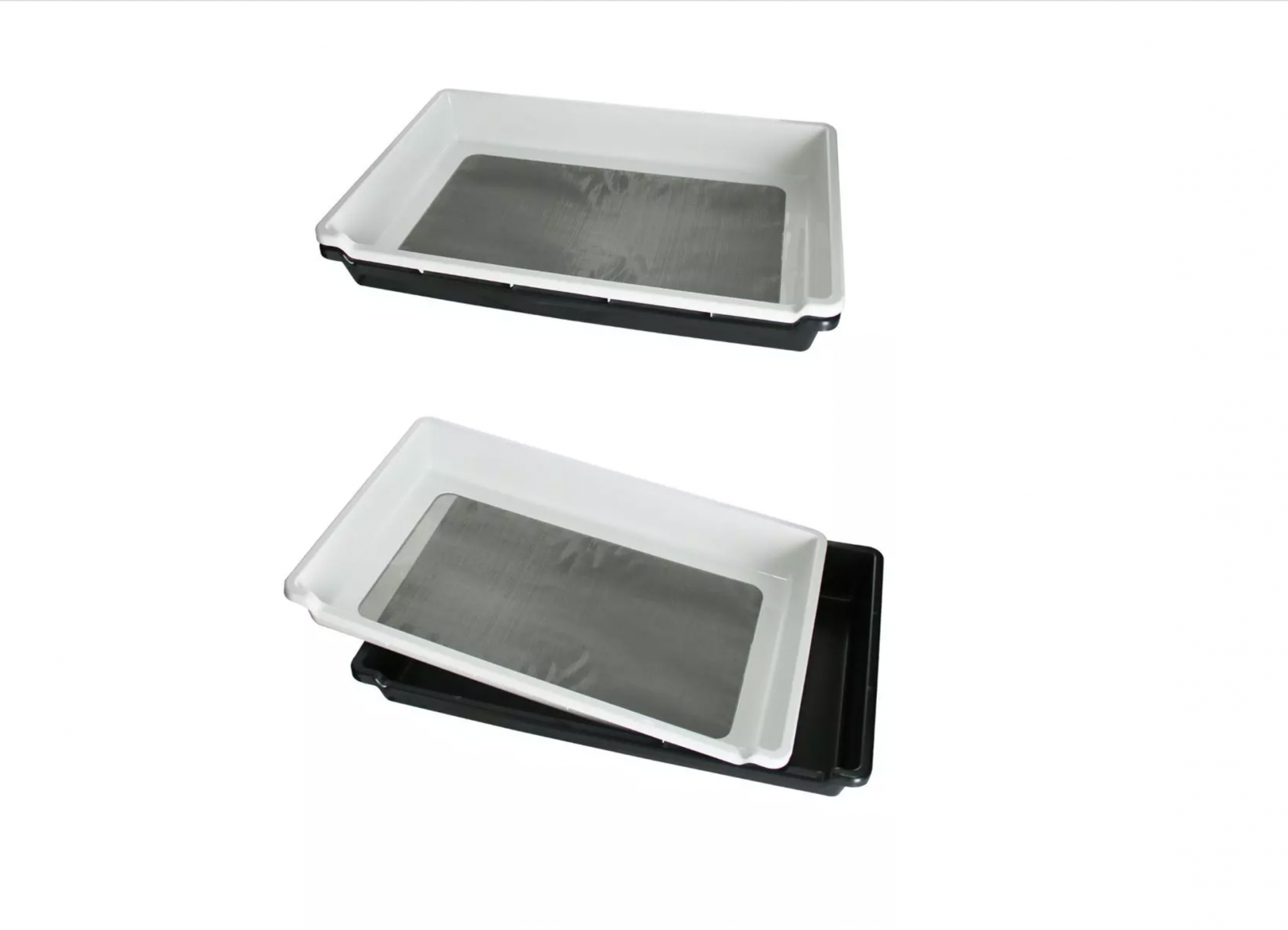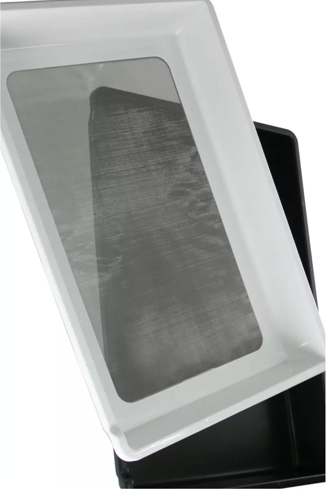 A bandeja de acabamento consiste em uma parte superior e uma parte inferior. A parte superior é feita de plástico e fica dentro da parte inferior (também de plástico). Tem uma peneira fina de aço inoxidável na parte inferior. A densidade da malha da peneira é 150microns. Você pode fazer cortes precisos em lugares pequenos e minúsculos com a ajuda da lupa do botânico incluída, que é particularmente prática e prática devido ao seu tamanho (aprox. 8,5 x 5,5 cm). Para garantir que nada do valioso material vegetal seja perdido, o pólen, as partes particularmente pequenas das plantas e o pó vegetal caem pela peneira na parte inferior do Trimtray. Lá você os pega para processamento posterior. Com a ajuda do pincel, você garante que nenhum grão ou pó seja desperdiçado.