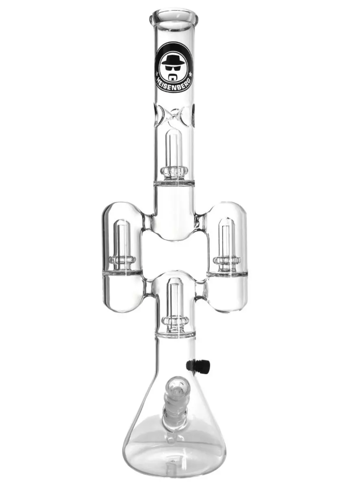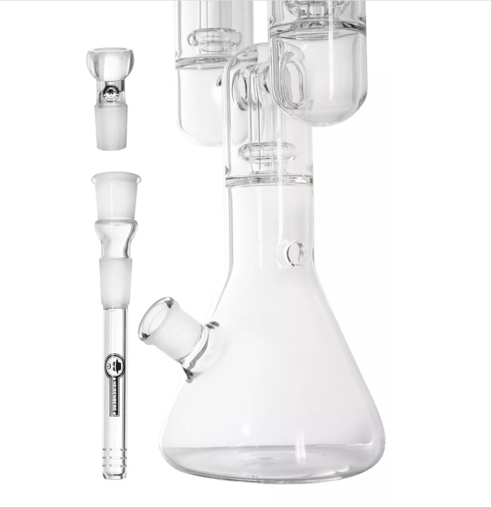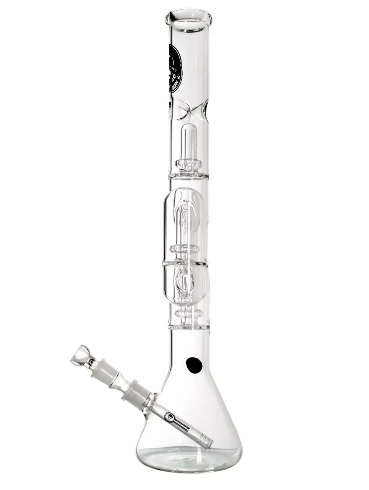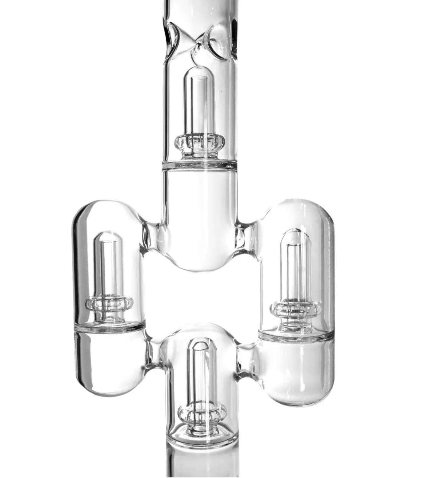 Há um total de 5 áreas para a dispersão da fumaça. O chillum termina primeiro em um difusor que se projeta no copo do bong. A partir daí, a fumaça é direcionada para uma câmara percoladora com Showerhead Perc estilo Ufo, onde passa por outro processo de resfriamento. Este procedimento é repetido em mais 3 coadores de chuveiro.