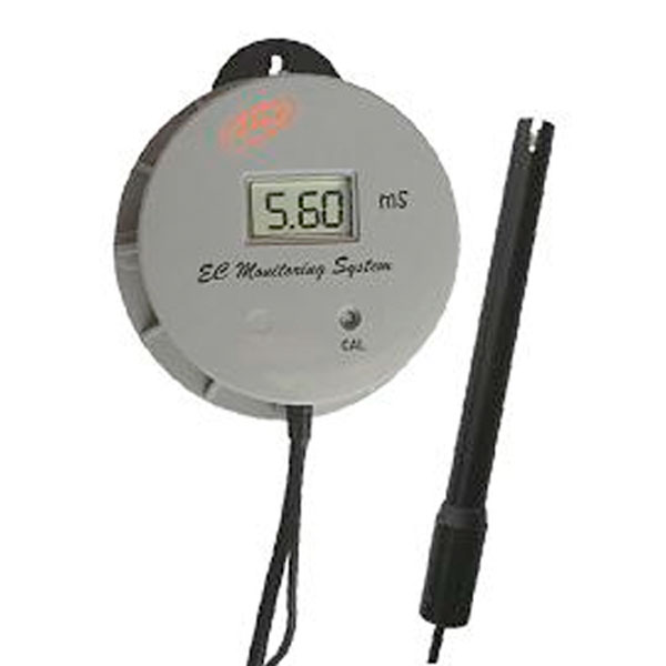 Indicador de EC contínuo. Possui uma tela com um indicador que permite visualizar a medição do EC. Carcaça de alta resistência com suporte para colocar próximo ao tanque de alimentação.