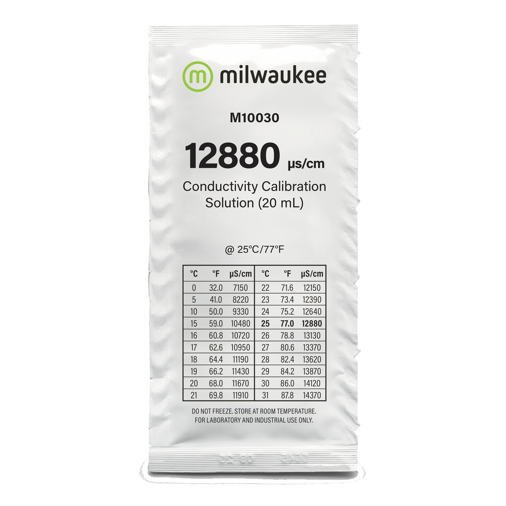 Calibrador EC 12880 da marca Milwaukee Líquido em saqueta de 20 mililitros para realizar a calibração de medidores digitais EC (Eletrocondutividade). Válido para medidores digitais básicos, medidores contínuos, monitores e controladores.