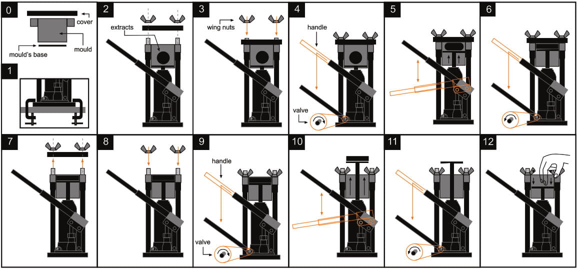 Antes de colocar a tampa na forma, sugerimos que coloque um pedaço de papel manteiga ou papel manteiga no meio para facilitar a remoção do bloco de haxixe prensado posteriormente. Prenda a tampa com os dois parafusos de aperto manual.