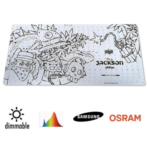Jackson é uma luz LED de espectro completo especialmente desenvolvida para cultivo interno. Esta placa quântica de baixo consumo e alta eficiência é fabricada com LEDs Samsung com uma longa vida útil de até 50.000 horas.