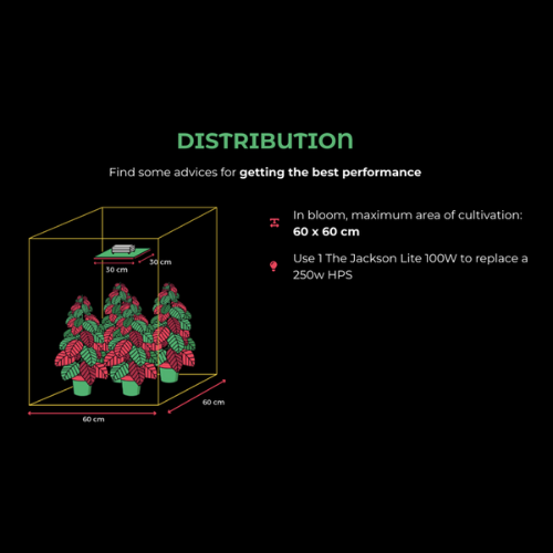 Esta lâmpada LED é muito eficiente e dá às plantas uma enorme quantidade de luz. Recomenda-se manter uma distância mínima entre o Jackson e as plantas para obter um grande benefício sem prejudicar as plantas.