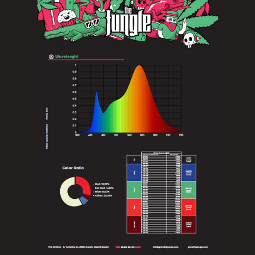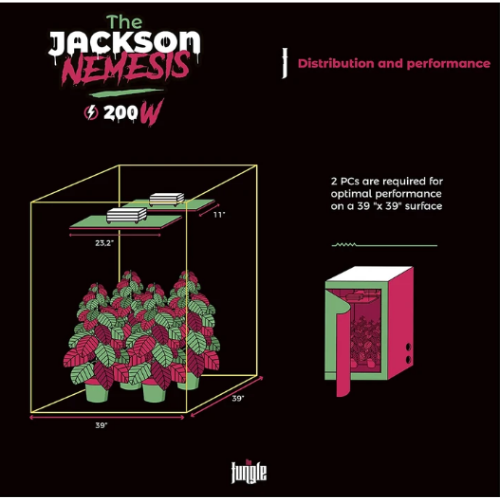 Os LEDs instalados neste painel são 580 x Samsung LM301H 3000K (580) e 84 x Osram roxo com 12,5% de azul. O modelo LM31oH é o melhor LED para jardinagem, funciona em 3 V e é mais eficiente que os usados até agora. Como resultado, a placa Jackson Nemesis possui mais LEDs do que um painel Jackson normal, melhorando seu desempenho.