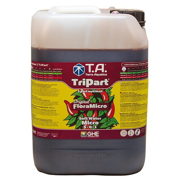 Disponível na composição de água dura ou mole, o TriPart Micro é a base do sistema de “building- block”, fornecendo micro e submicro-nutrientes e alguns macro-nutrientes complementares. Use TriPack Micro como indicado durante todo o cultivo desde o crescimento até à floração